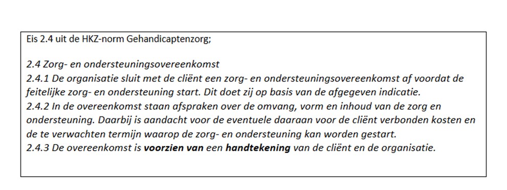 Daar waar in de HKZ-normen wordt gesproken over het ‘vastleggen’ of ‘voorzien van een handtekening’ bij een zorgovereenkomst, wordt deze eis losgelaten. Dit geldt onder andere voor: