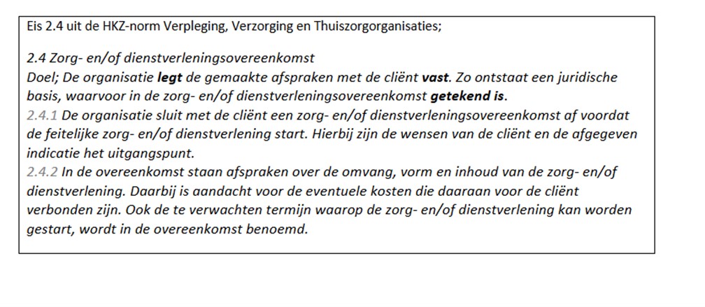Deze tekstwijziging wordt formeel doorgevoerd in de volgende herzieningsronde van de HKZ-normen, maar is vanaf heden al van toepassing. Een ondertekende schriftelijke zorgovereenkomst is daarmee niet langer vereist om aan de HKZ-eisen te voldoen. In plaats daarvan volstaat een werkwijze die juridisch is goedgekeurd binnen het Programma ‘Ontregel de Zorg’.